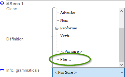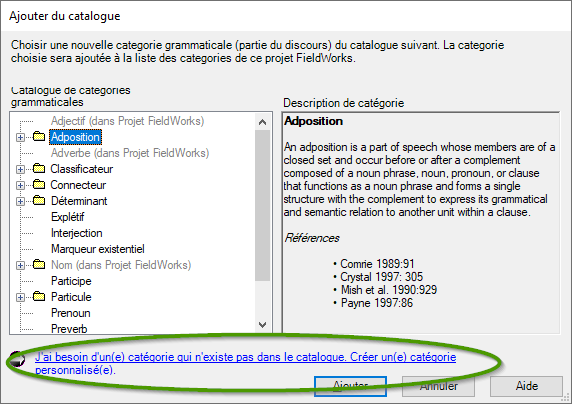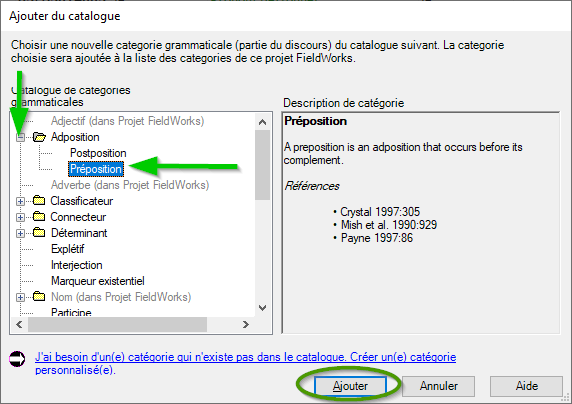Sélectionnez la catégorie dans la liste, et cliquez sur Ajouter. Parfois vous devez fouiller un peu, par exemple Préposition se trouve sous Adposition, donc on doit ouvrir ce dossier (avec le petit plus) pour le trouver.