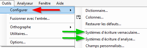 On peut ajouter les systèmes d'écritures additionnels et éditer les systèmes existants dans la boîte de dialogue Propriétés du projet FieldWorks. Certains utilisateurs veulent ajouter des systèmes d’écriture pour la transcription phonétique (IPA), orthographe traditionnelle, etc.