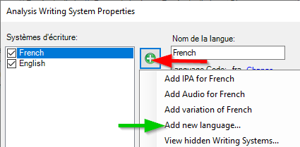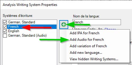 Si le système d'écriture est déjà présent (ci dessous French), il suffit de le sélectionner et de cliquer sur l'icône + et de choisir l'audio pour ce système d'écriture (Add Audio for French).